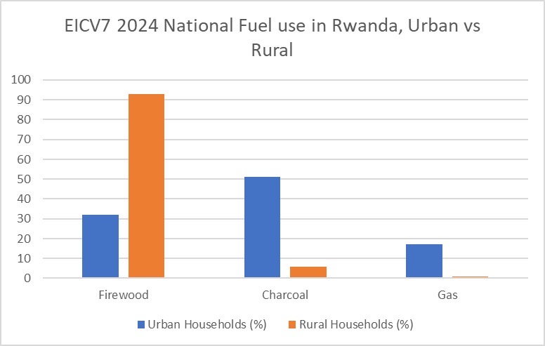 According to the latest Integrated Household Living Conditions Survey 7 (EICV7) conducted in 2024, there is a notable difference between urban and rural areas in Rwanda: 32% of urban households use firewood compared to 93% in rural areas.