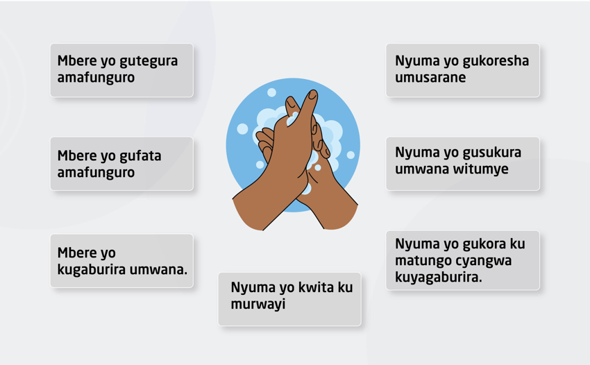 Ibyo bihe birimo gukaraba mbere yo gutegura amafunguro, mbere yo gufata amafunguro, mbere yo kugaburira umwana, nyuma yo gukoresha ubwiherero, nyuma yo gusukura umwana witumye, nyuma yo kwita ku matungo cyangwa kuyagaburira ndetse na nyuma yo kwita ku murwayi.