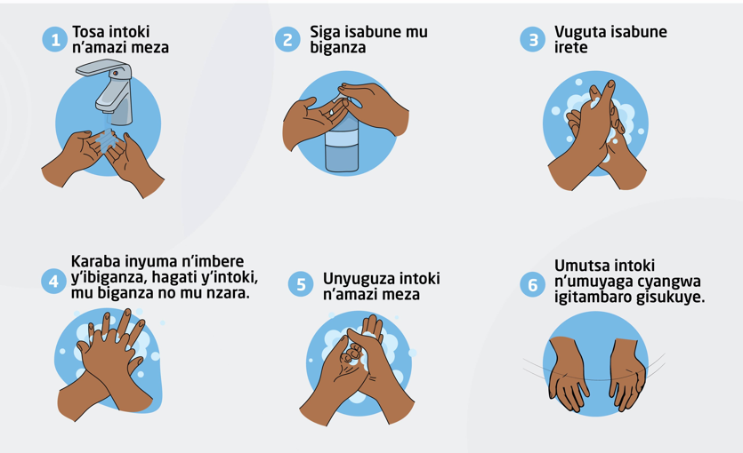 RBC kandi yibutsa ko gukaraba intoki bikorwa hifashishijwe amazi meza n’isabune igihe cyose, no mu gihe intoki zaba zitagaragaza umwanda; kuko ari bumwe mu buryo bwizewe bwo kwirinda indwara ziterwa n’umwanda na bimwe mu byorezo.