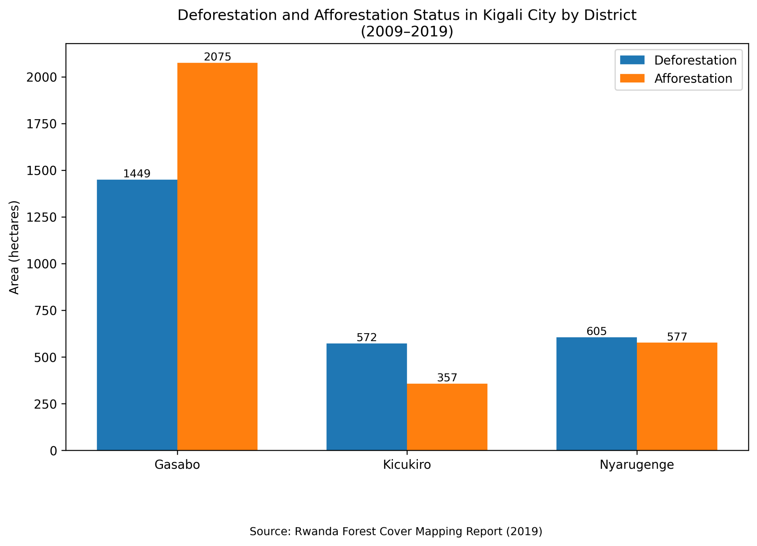 Changes in forest cover since 2009 reveal both deforestation and reforestation trends. Over a ten‑year period, reforestation reached 26.4 percent, while deforestation stood at 23 percent, resulting in a marginal net annual increase of just 0.3 percent in Kigali’s forest cover.